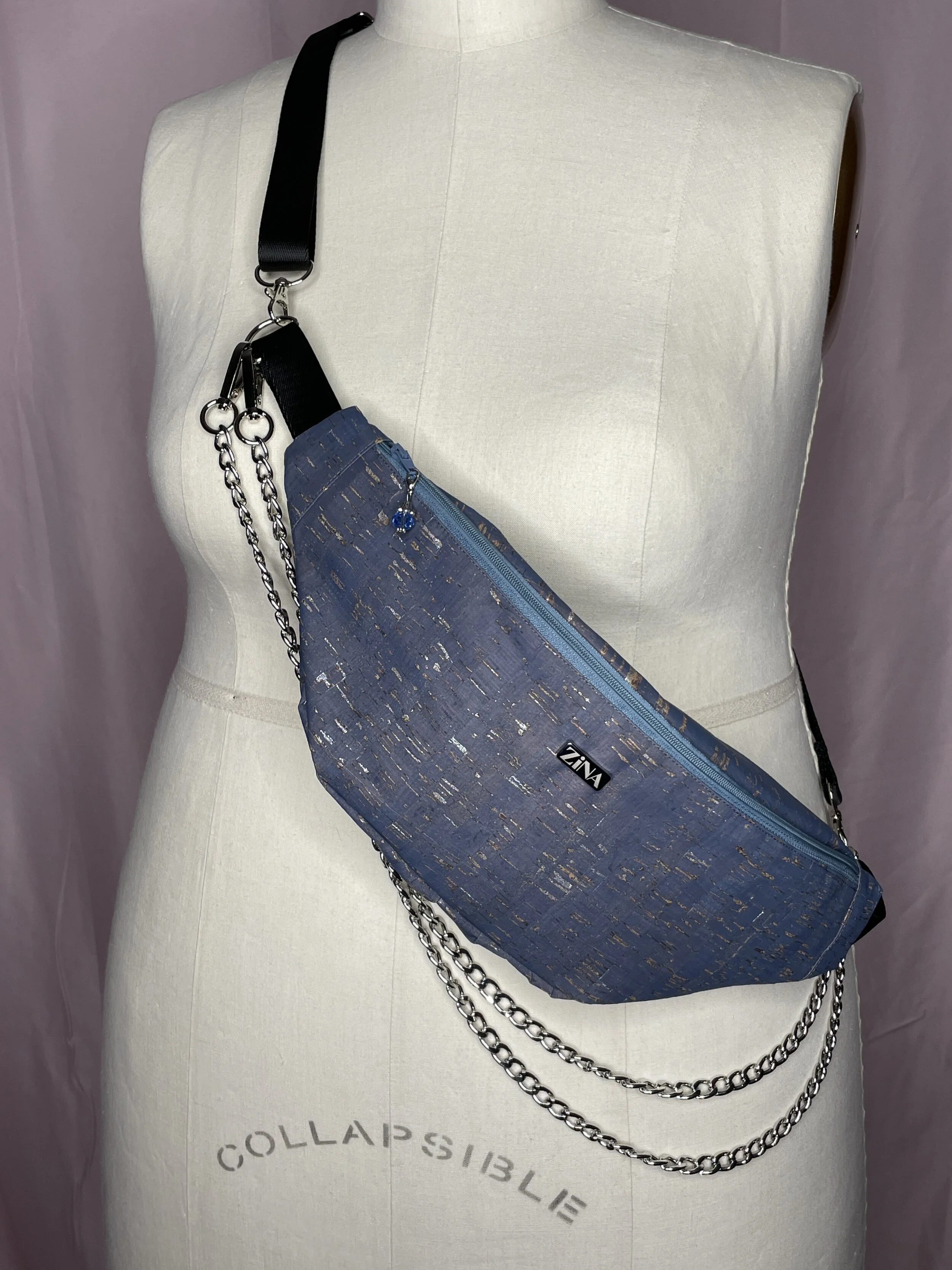 I love bag making. I always have. I’ve designed a few bag patterns (the V-day clutch and the Round Bag). I love that the fanny pack has made a comeback. I remember shopping for a fanny pack a few years ago. I loved the designs, but the problem I ran into was that the strap didn’t adjust enough to fit my waist. I could wear the pack as a crossbody bag but sometimes you want to wear a fanny pack around the waist. So I decided to make my own pack. I made a few bags for my son and then I found inspiration online for a fanny pack with a chain decoration. I knew immediately that I wanted to recreate the look.