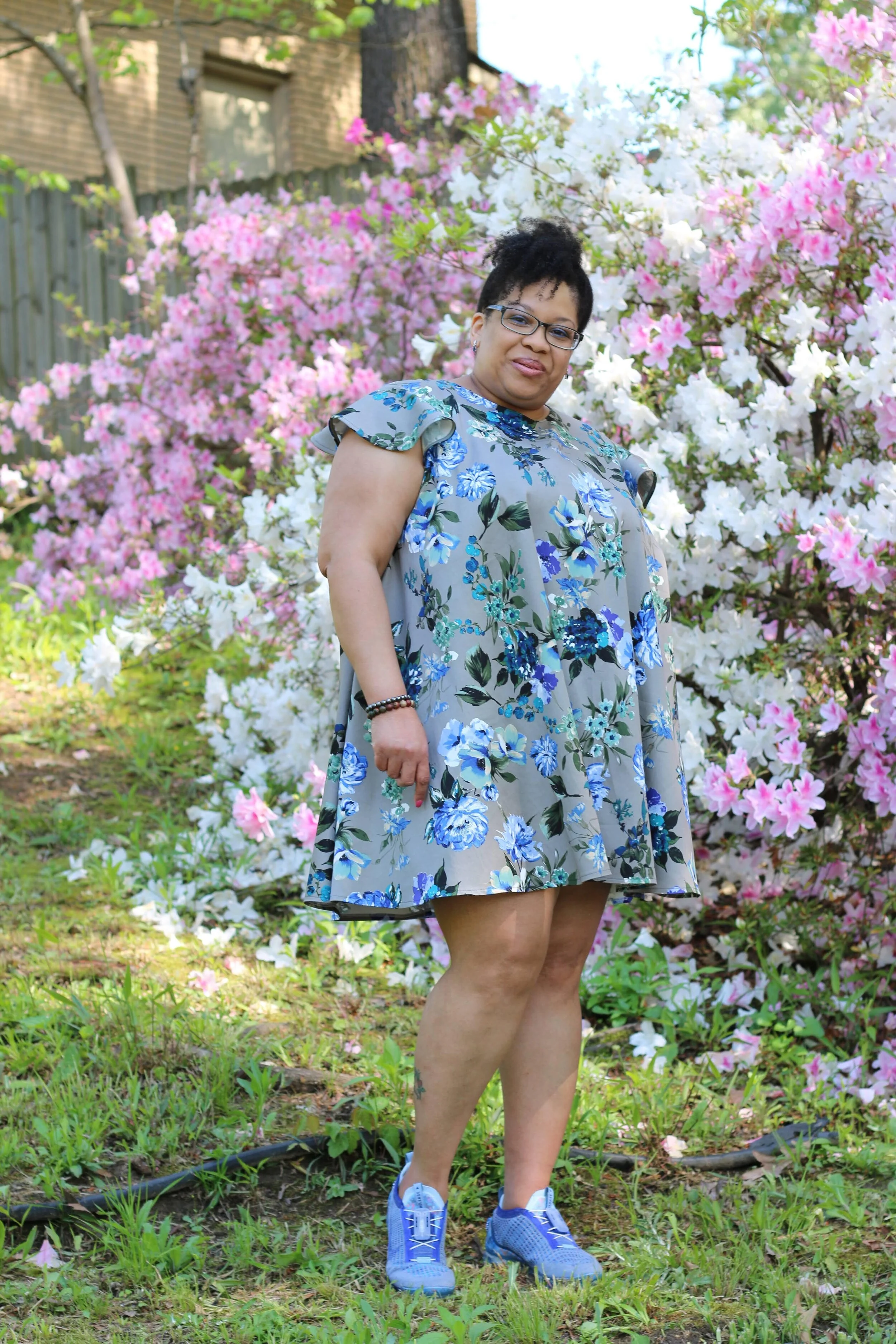 In making the swing dress, I cut the front and back pieces on the fold. The fabric wasn’t wide enough for the swing, so I cut to the end and made a side slit in the shape of a V. On the back piece, I cut into the fold about five inches down to add a button and elastic. This was to allow enough room to get my head through. I did a zig zag stitch around the opening to keep the fabric from fraying. I added pockets and a flutter sleeve. I love how this turned out. I decided to concentrate on the royal blue in the print and wear shoes to accentuate that color. I wanted to show a casual look with tennis shoes as well as a dressy look with stilettos. I hope you enjoy the photos.