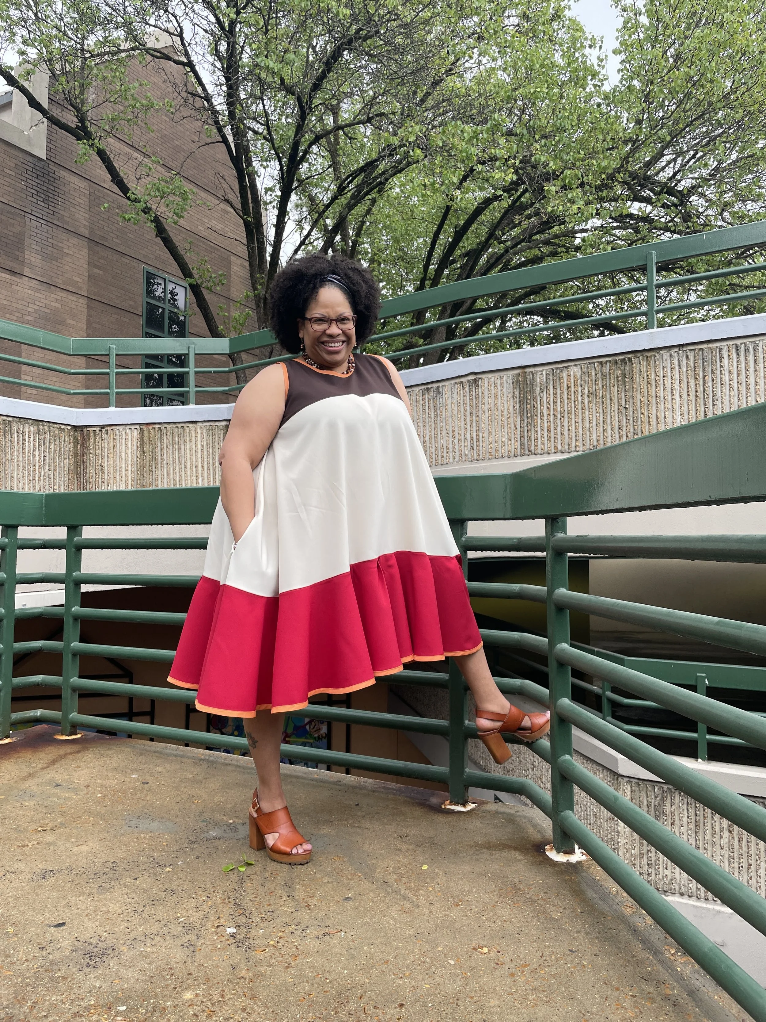 Fabric choice: Now back to the dress. I decided to use some fabric I bought years ago from Hancock’s Fabrics. I am not sure what type of fabric it is. It’s a woven (non-stretch) fabric. It feels like a rayon/polyester blend. But since I had several cuts in different colors, I decided to use it to color block this dress. I choose brown for the top bodice; cream for the middle section; and red for the bottom ruffle. I also wanted to add some bias binding for more color blocking. I chose a carrot color bias tape and decided to use it on the top bodice and on the hem of the ruffle. I also used carrot color thread for topstitching.